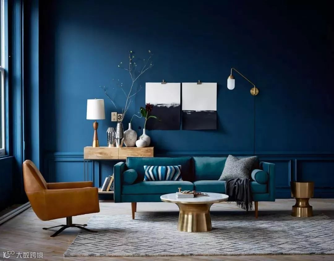 大面积使用蓝色时,建议搭配明亮的白色或浅色原木家具。跳跃的撞色能打破蓝色的低气压,中和整体色调,让空间更有层次感
