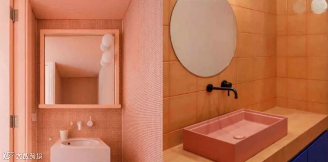 现在流行浴室做的更有趣味一些,很多使用有彩色,而不仅仅是单纯的白色,你看洗脸池的部分就用到了珊瑚粉。