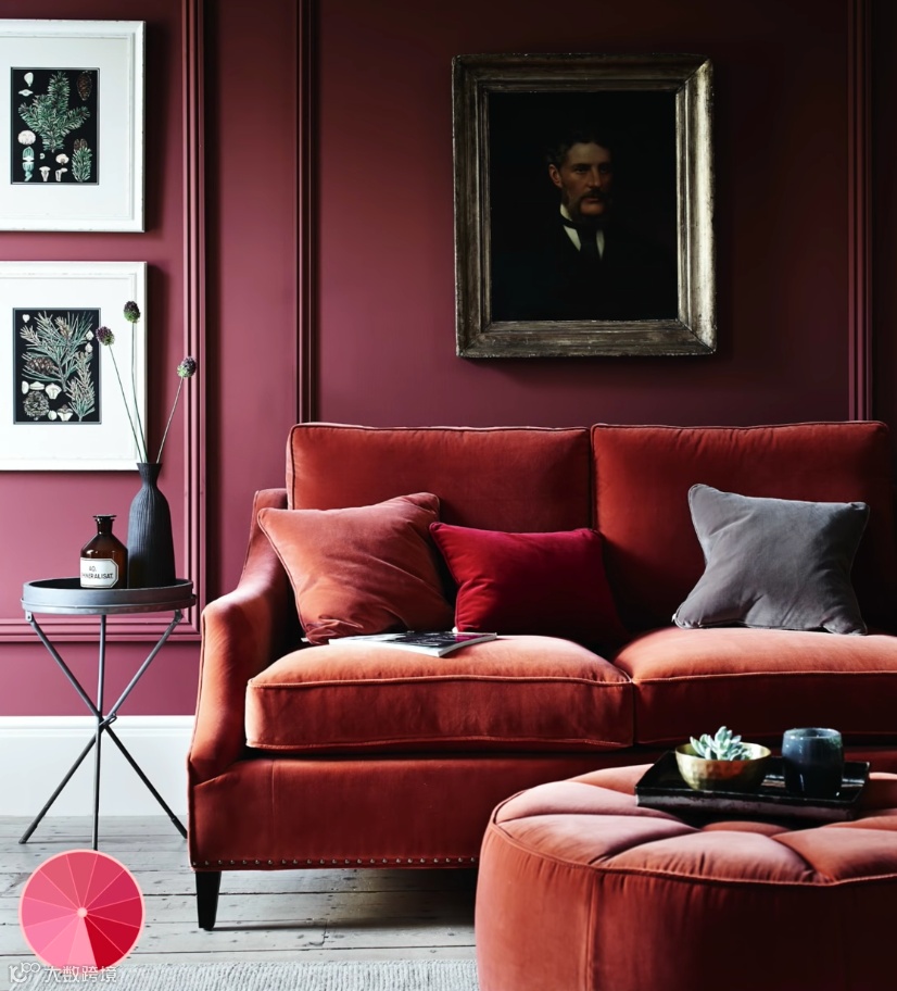 【低明度的红色】这是一个单色系的配色,但是用到了不同的高低明度,所以室内会打造的很有层次感。