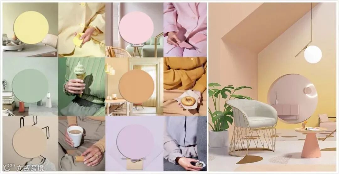 【天空蓝】这个颜色非常有活力、有能量,从图中我们看到,天空蓝可以和蘑菇灰、珊瑚粉搭配在一起。