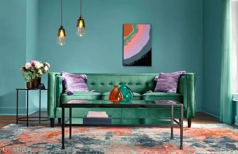【云杉绿】沙发的部分用到了和后面墙面部分一样的蓝绿色,此外房间中还有其它流行色,比如靠包部分用到了浅紫色,地毯部分用到了珊瑚粉和灰色。同时我们也注意到,窗帘的颜色和墙面的颜色是一致的。
