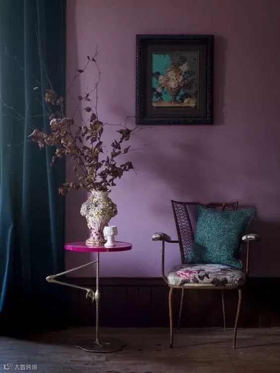 【中性紫色】这个房间当中,中性紫色是用在一面墙上,在整个空间当中做点缀。