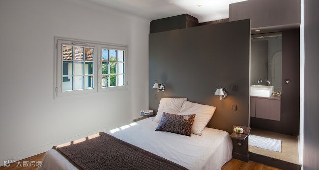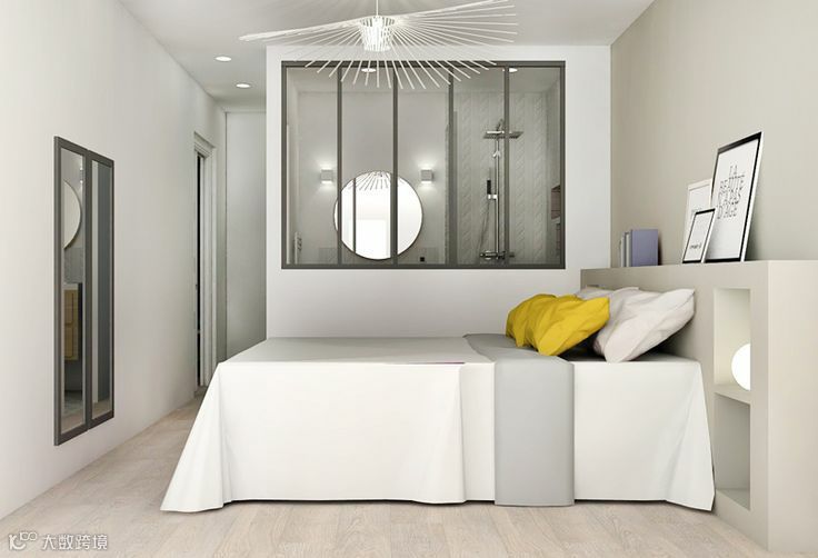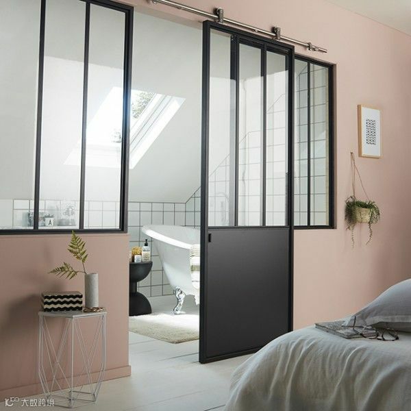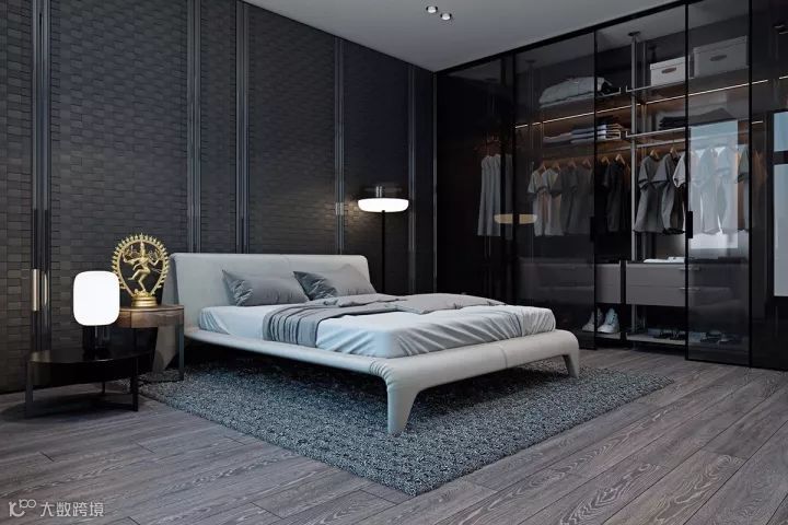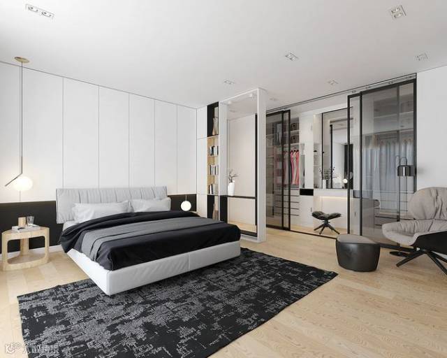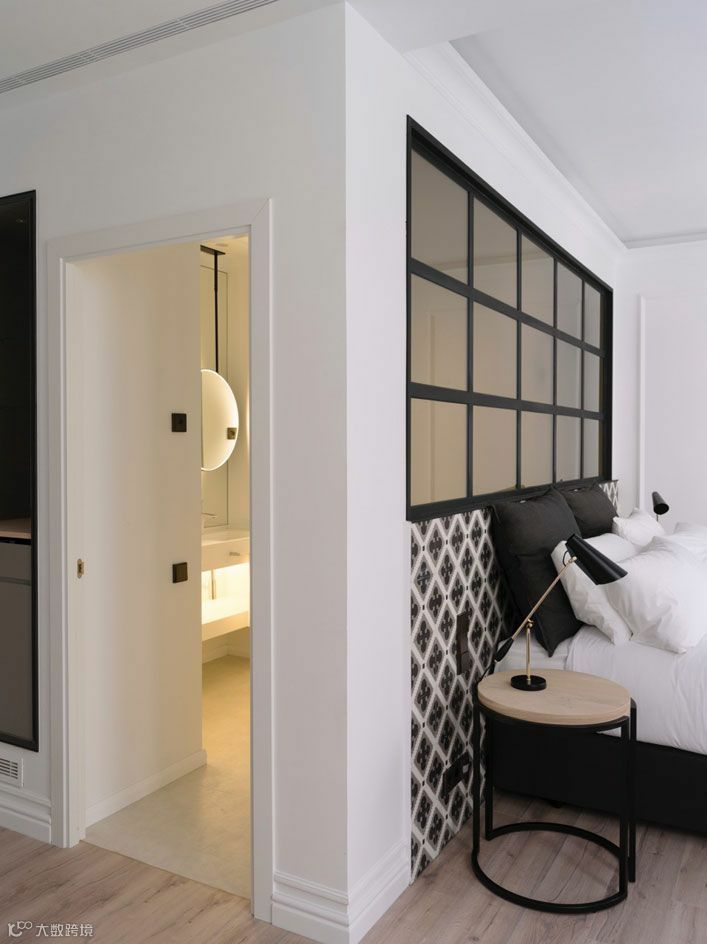 用黑框玻璃窗来阻断卫生间与卧室的界限,不仅可以解决暗卫本身存在的采光问题,而且视觉上更具时尚效果,令整个卧室的质感瞬间提升。