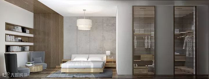 与主卧风格在色调、材质上形成呼应的木质镂空门,在发挥隔断作用的同时,也尽可能地保留了空间的层次感,气质上非常吸引眼球。