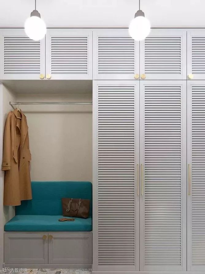 这种样式的柜子一般设计在靠窗位置,中间部分留空,用来悬挂衣服、包包、帽子、运动器材等出门常用的物品,也方便坐着换鞋和享受惬意的休闲时刻。