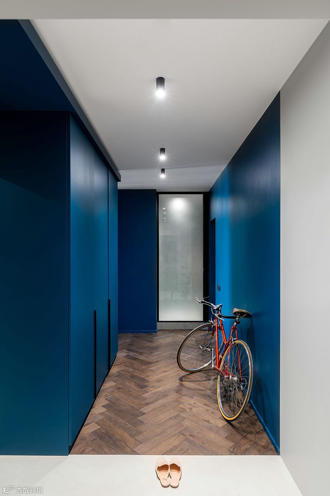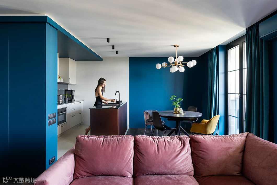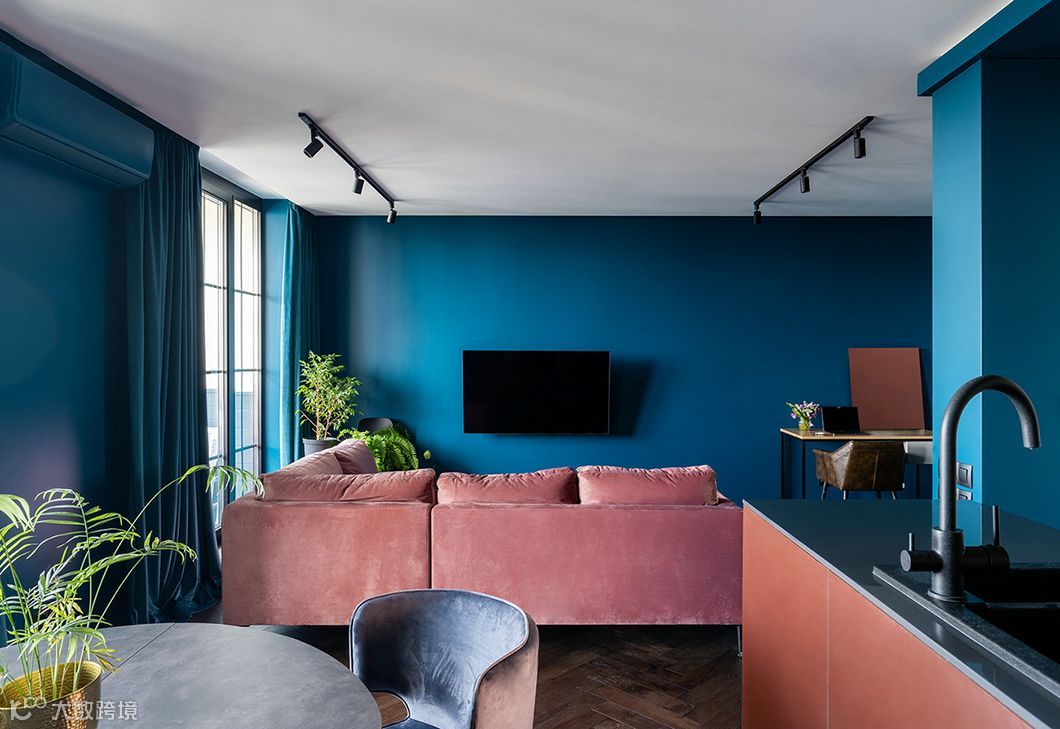 同样以深色调为主,蓝色的墙面白色的天花板,加深了空间纵深又增加了层高。