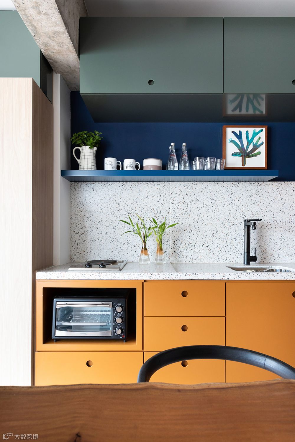 ,运用抢眼雾灰绿、暖棕橘与鲑鱼粉与经典蓝,交叉错落铺排和谐比例,展现俏皮活泼的空间