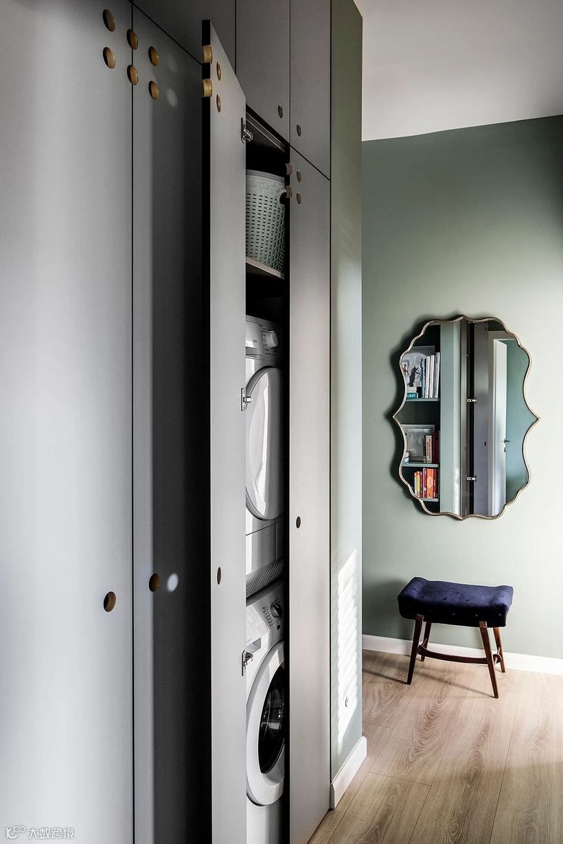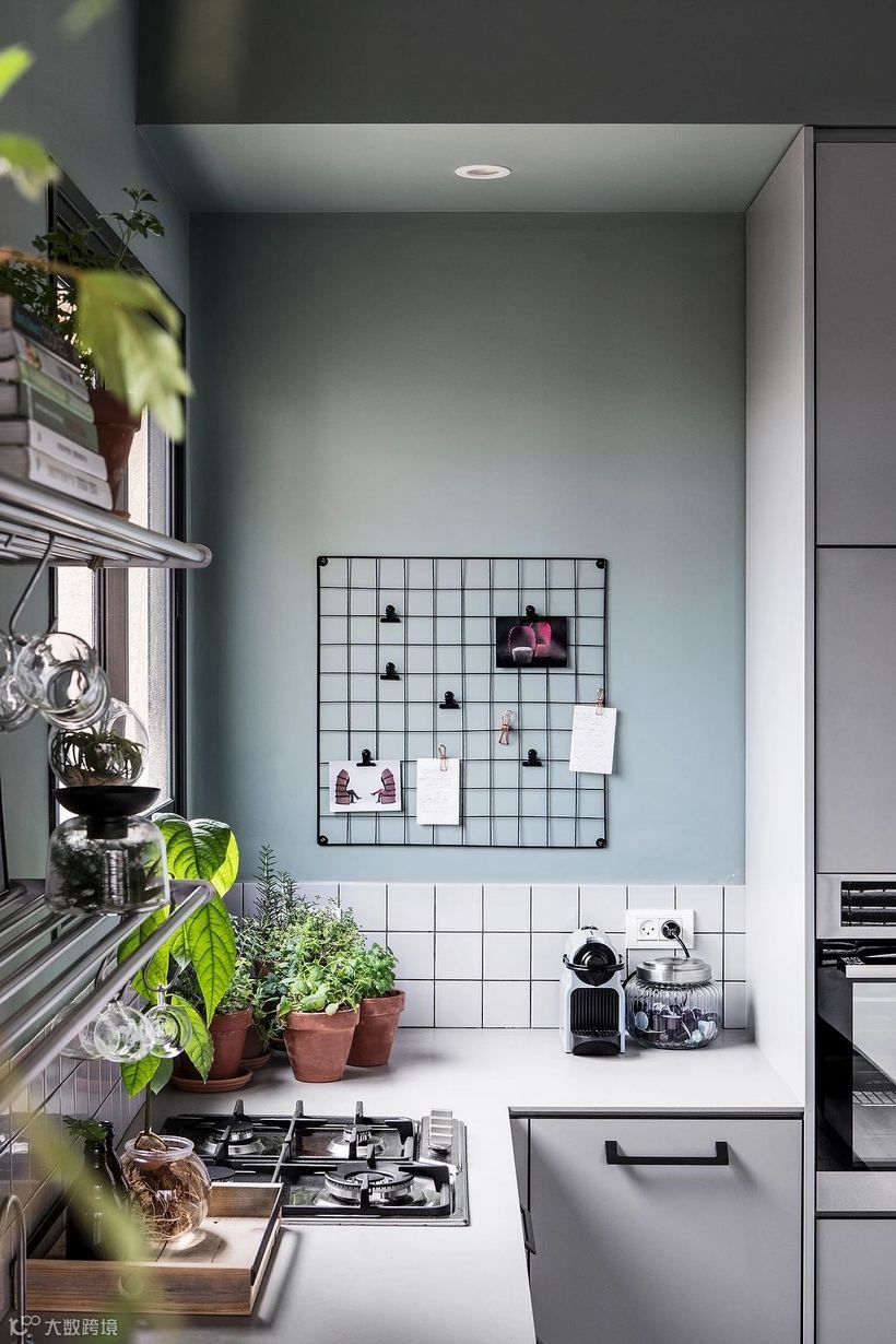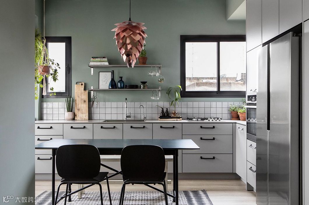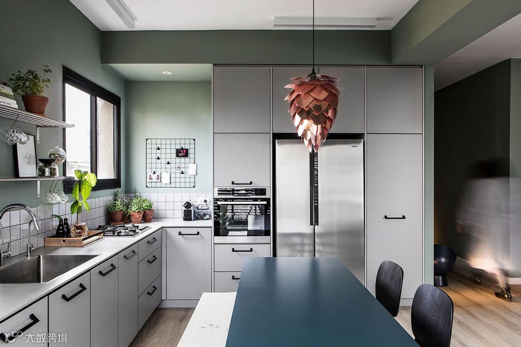 宛若蒙上一层白灰的灰绿调,带给室内犹如冬日般柔和静谧感受,在日光映照之下,呈现