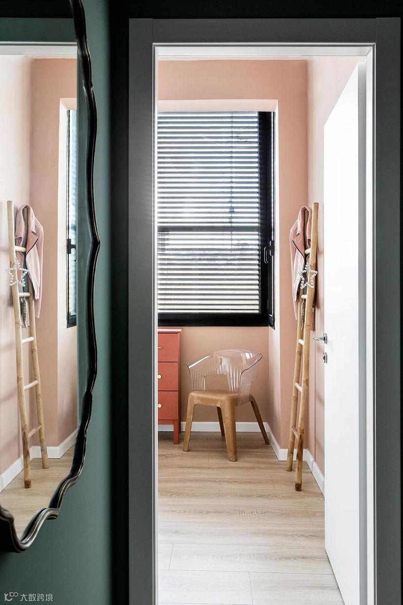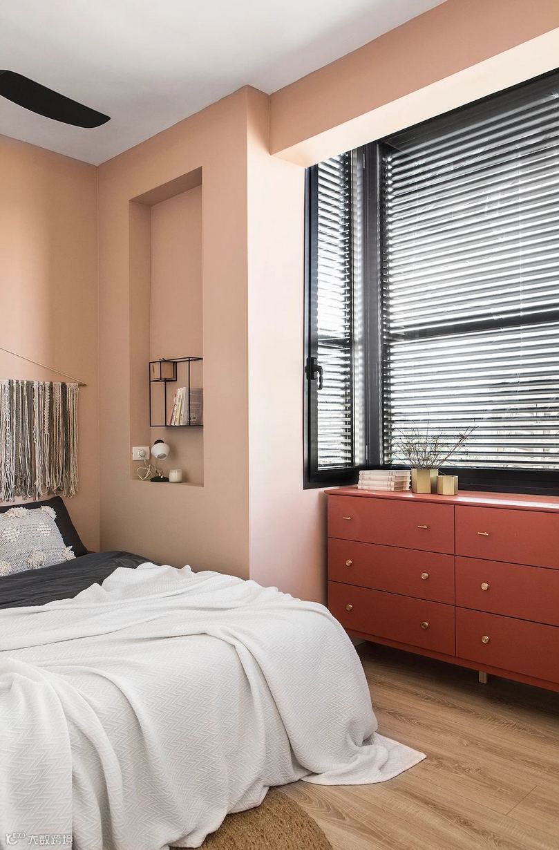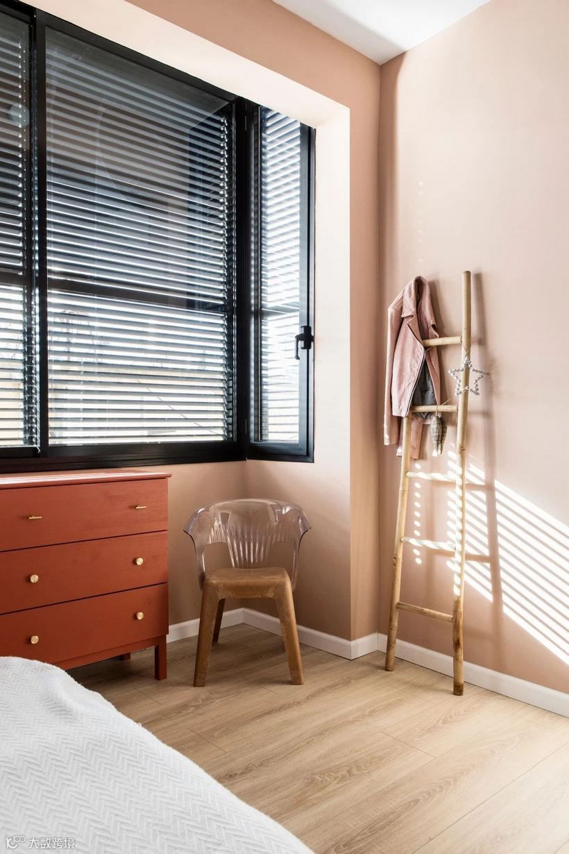 选用藕粉色为主,室内还选用了相同颜色的窗帘做分隔,呈现一区多用的状态。
