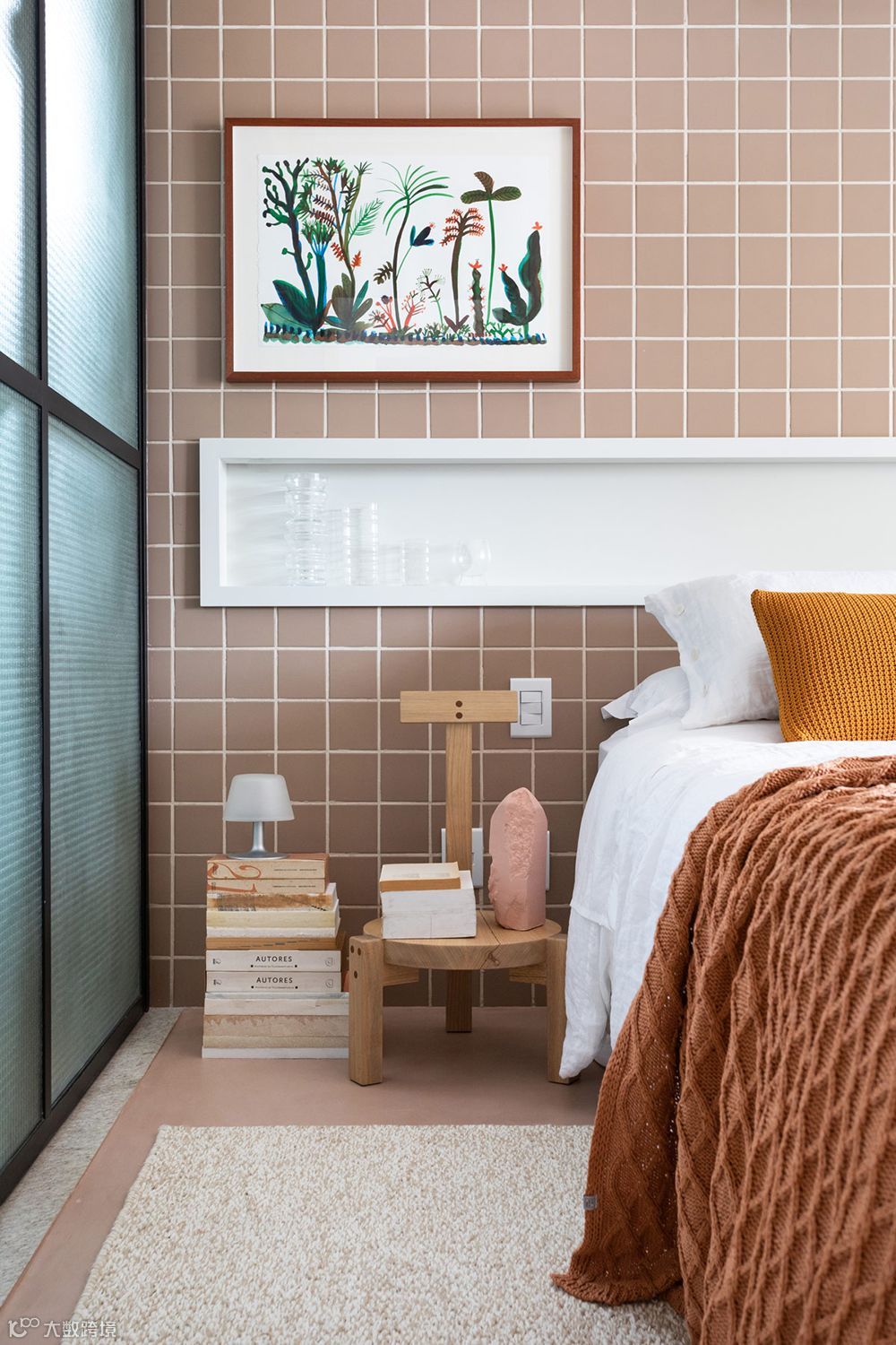 ,活用中柱化做电视墙,展露极佳机能,卧房与卫浴采用相同粉棕橘壁砖,续接有条不紊的视感。