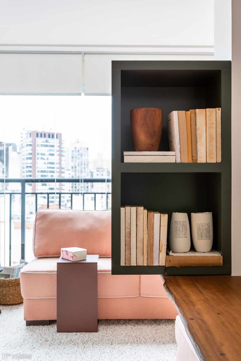 选用粉色的沙发带来了一丝活泼感也增添了浪漫氛围,同时也作为隔断使用。