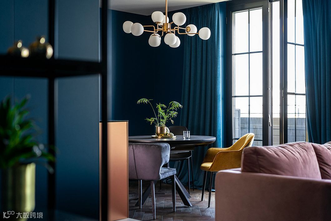 由黑色的圆桌搭配不一样的餐椅,顶部还有球形吊灯照明。深蓝色的窗帘与墙面有颜色一致,拉上窗帘整个空间就形成一个整体,再搭配上绿植更有活力了。