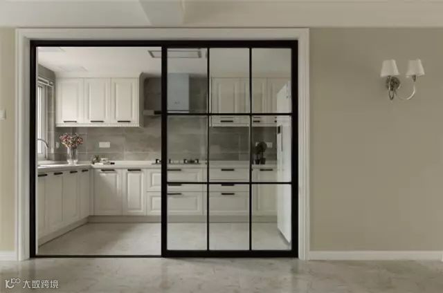 12、厨房门的颜色,与它旁边的柜体统一黑色,比如下面这个与玄关鞋柜靠在一起的厨房门,则以白色的搭配,呈现出一个优雅高档的氛围;