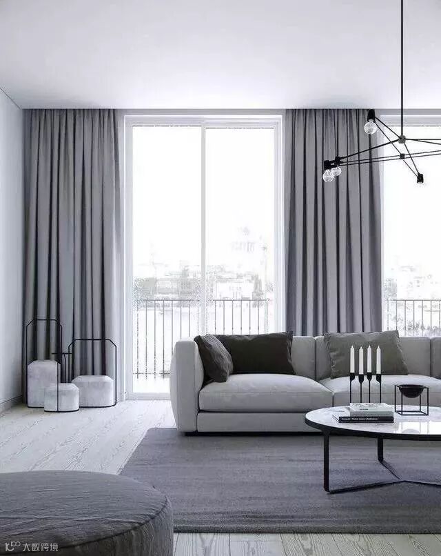 沙发是灰色,窗帘也可以搭配灰色的,视觉上会比较统一,不会出错。如果担心太过于单调,可以增加两个亮色(明黄色)的抱枕。