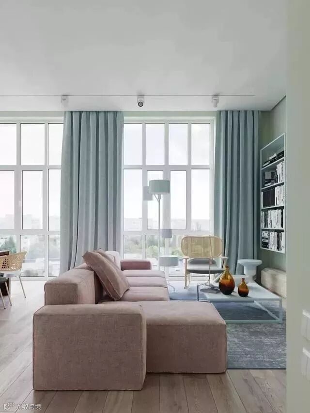低饱和度的轻波普搭配也很出彩,烟粉色的沙发搭配莫兰迪绿的窗帘,文艺又清新。