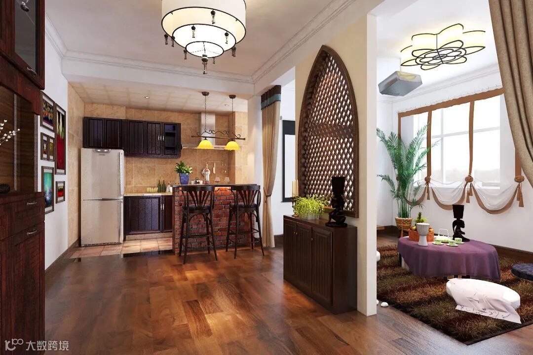 东南亚风格,讲究色彩艳丽,半哑光漆面黄色系地板,拼花或者双拼地板来搭配;
