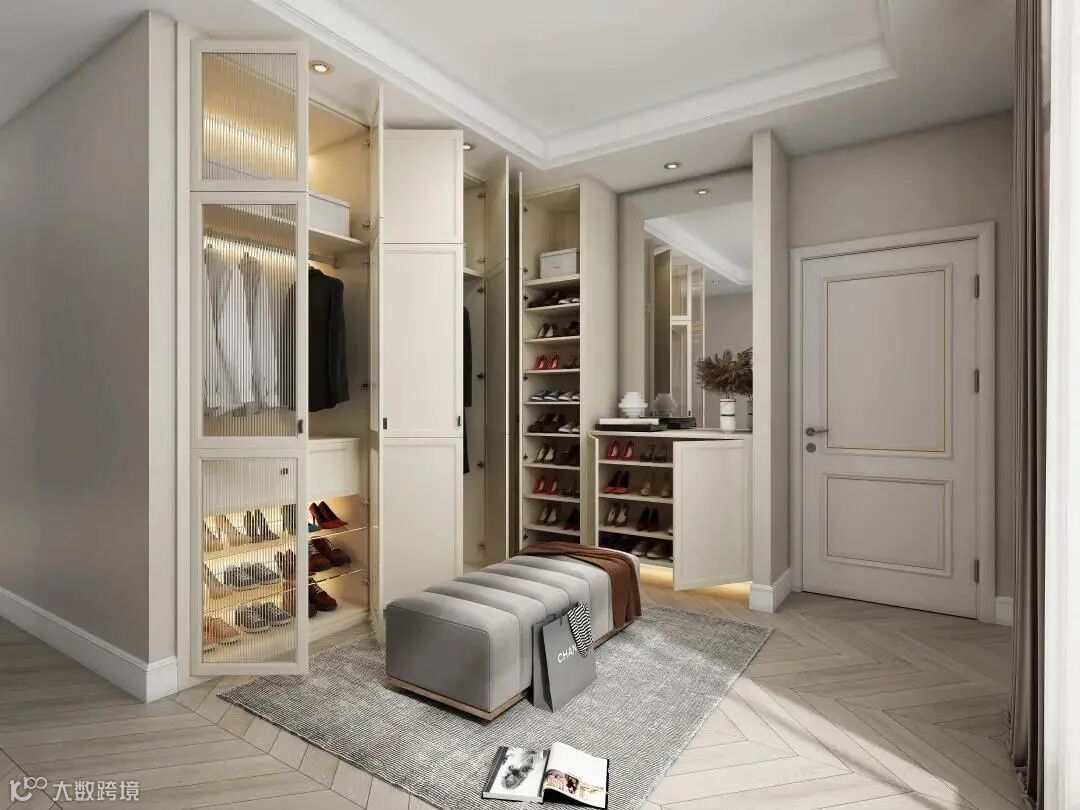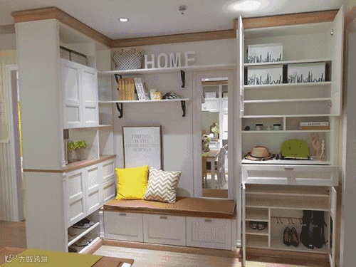①入户花园型:贴墙定制L型转角收纳柜,根据需求满足鞋柜、储物柜、衣帽间、功能房等需求。