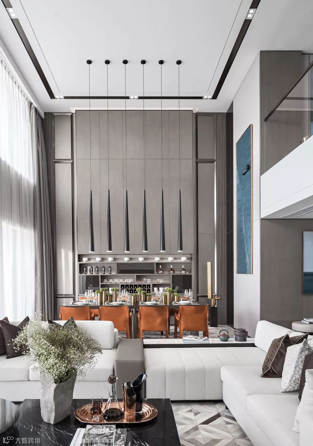 挑高空间设计吊顶,一般需要搭配灯饰以及单层或多层装饰线条进行修饰,巧妙地提升空间层次。