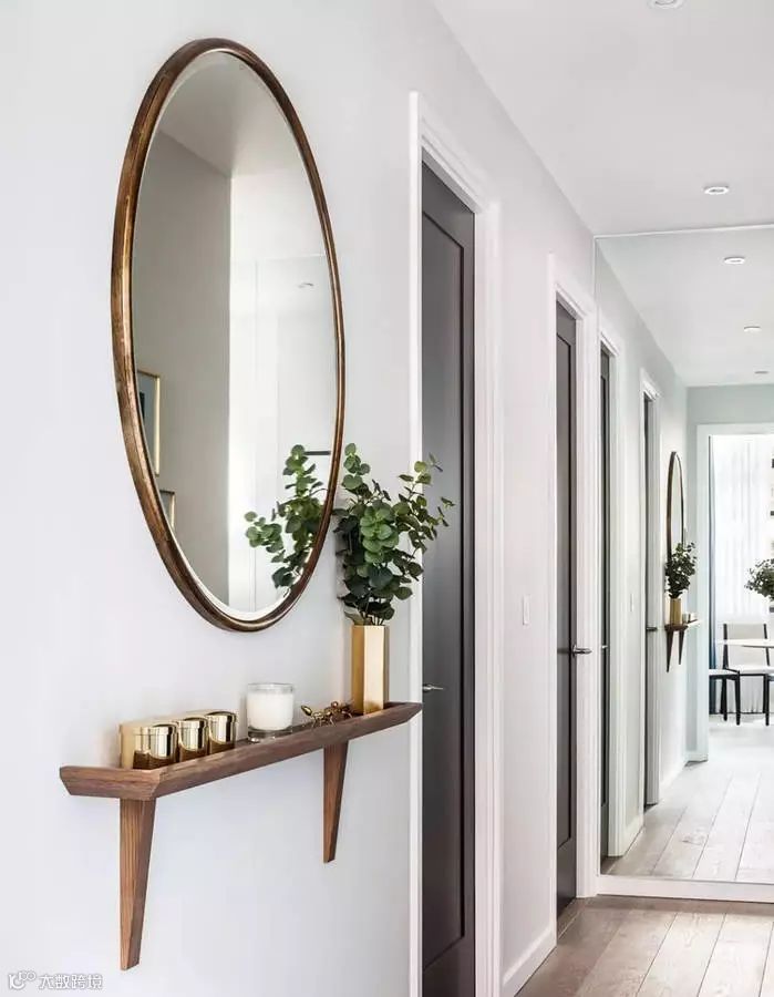 为了节省走廊的空间,可以用狭窄的架子替换控制台,方便折叠钥匙,放置小雕像,蜡烛,花瓶和喜欢的小东西。建议在大厅正上方悬挂一个不能在大厅中取消的镜子。