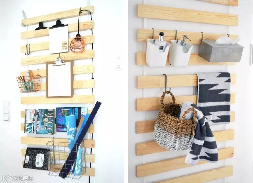 使用您的聪明才智 - 原始墙壁装饰的基础可以是床垫所在的最普通的床栏(例如,来自宜家)。可以很容易地将钩子和夹子固定在木制横梁上,用于各种家居用品。您还可以在这里挂杂志和报纸的灯具和部分。