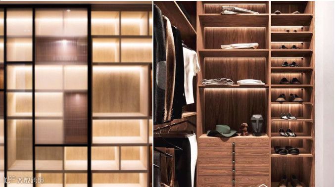 在衣柜内部隔板下方做上感应灯带,打开柜门就会自动亮。