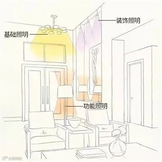 重点照明、装饰照明、基础照明的关系就如同数学中常用的“点线面”,以客厅为例,一张图瞬间get。