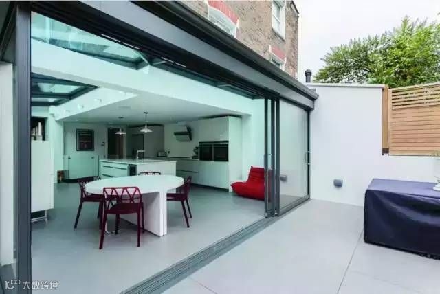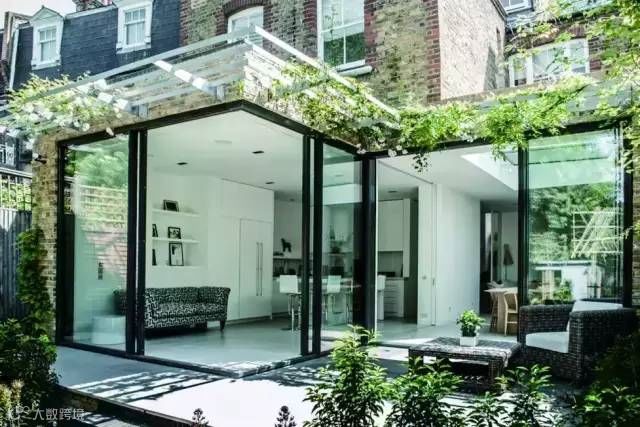 虽然全玻璃设计的阳光房在外观上相当吸引人,但实际情况却是,英国的天气并不适合这种设计。更聪明的解决方案是选择在某些部分安装玻璃片,这样一来可以在天气晴朗时保证采光,如果天气允许,还可以通过打开玻璃门的方法来增加采光。