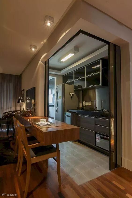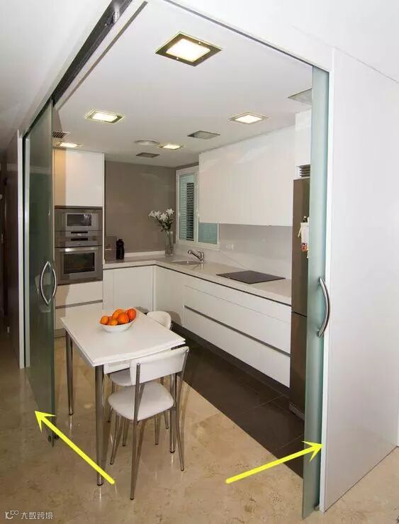 内嵌轨道门分隔功能区的优势在于:丝毫不占用空间面积,特别适合小户型。设计师正是考虑到我家户型小又多油烟,所以建议安装这样内嵌轨道门实现功能区分隔。