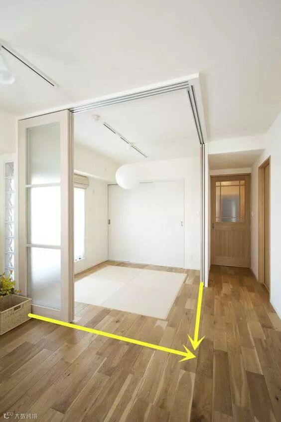 利用L型轨道门分隔功能区有2种做法:将2扇轨道门分列两侧,在原有墙体的基础上安装,形成45度或90度的阴角,实现开合。