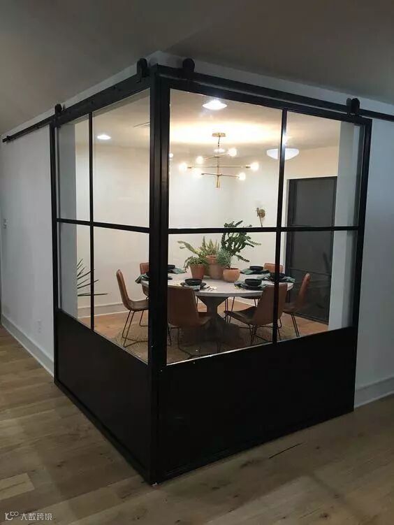 吊轨门在室内装修中是很常见的,将轨道安装在墙顶面上,然后安装玻璃或实木门都可以,通过顶面轨道实现开合,从而分隔功能区。