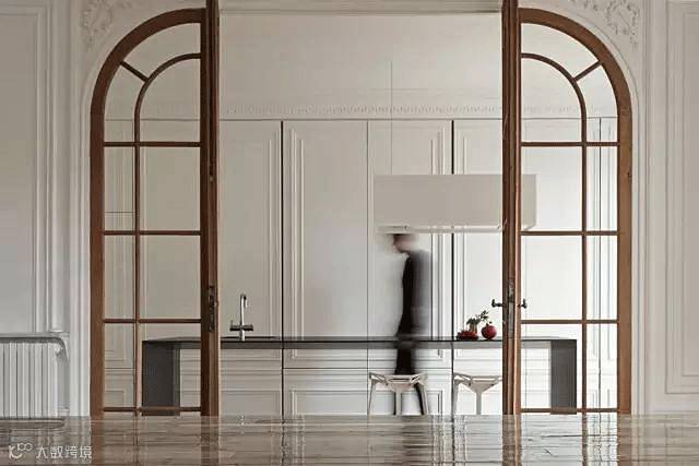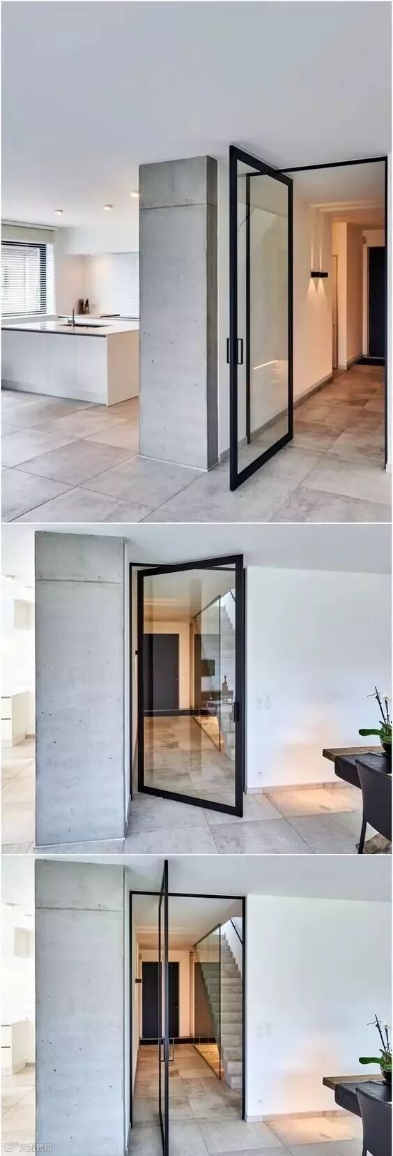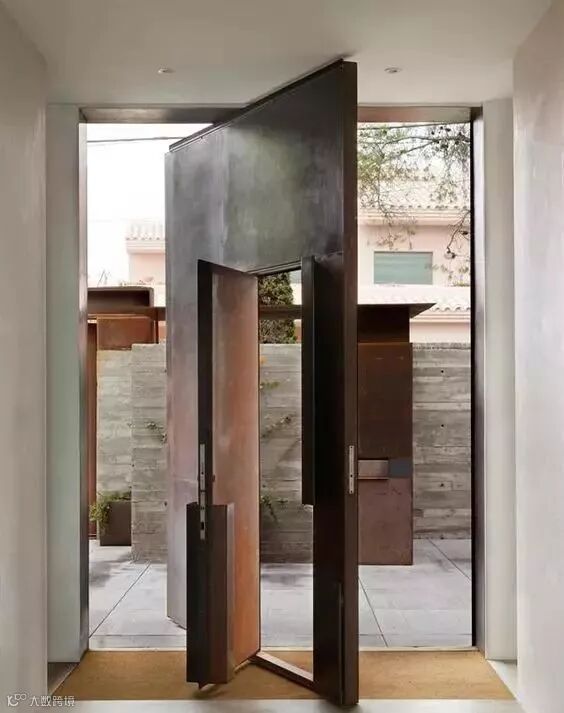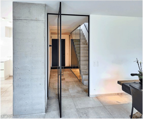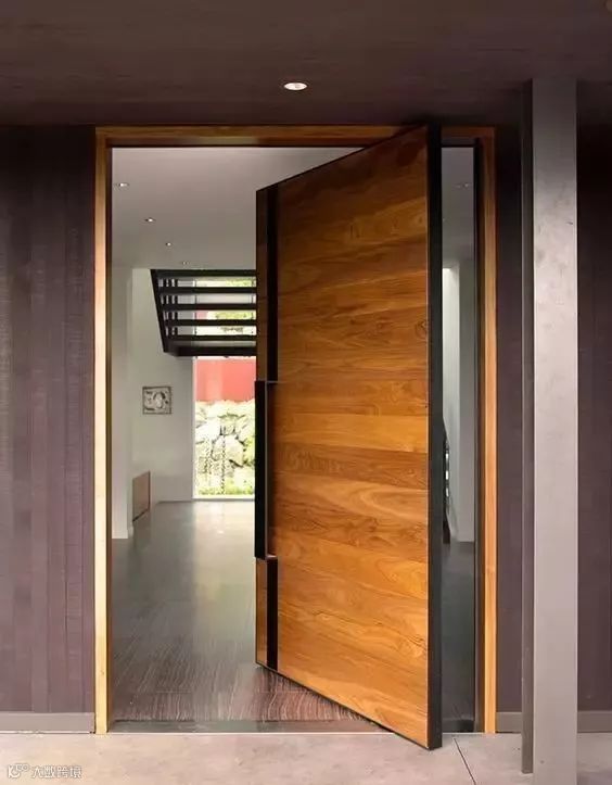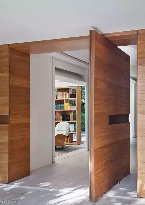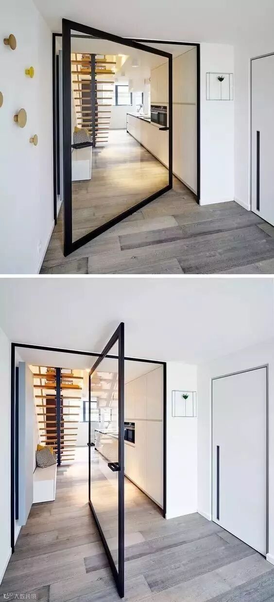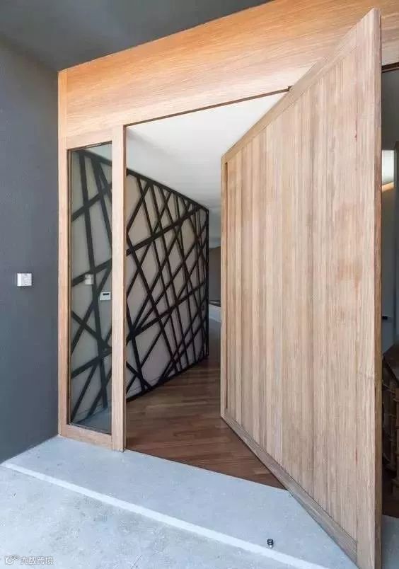 中轴转门乍看之下没什么特别的,但开启之后却呈现完全不一样的观感,因为门的上下部中轴处设置了铰链,推开之后刚好可以卡在中间,展示了一种不同寻常的打开方式,让门扇更加的具有灵活性。