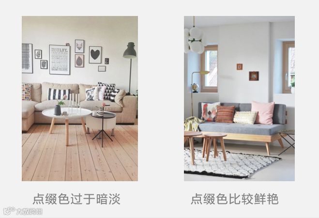 而另外一种搭配是比较恰当的,使用的点缀色色相与整体空间色彩有所区别,比较鲜艳。