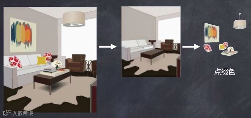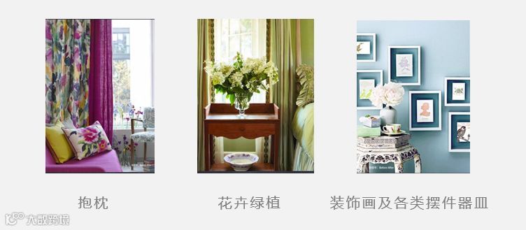 像挂画、灯饰、摆件、抱枕、花艺等这些小物品的颜色属于室内的点缀色(常指室内环境中最容易变化的小面积色彩),往往选用对比色或高纯度色彩来加以表现。