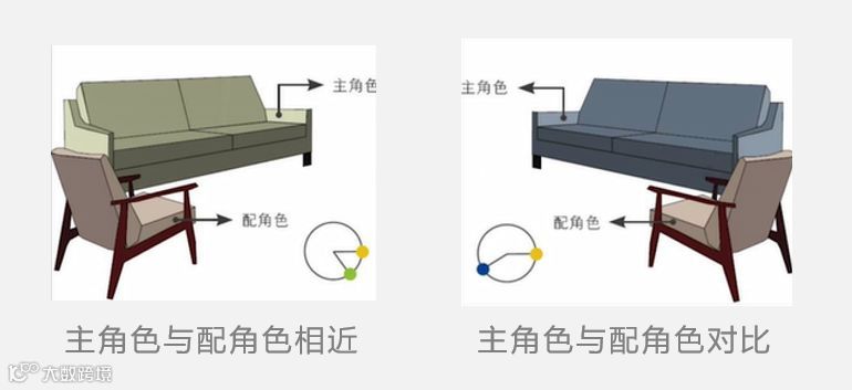 在这里以客厅空间中的沙发和小型沙发椅为例:沙发的颜色为主角色,沙发椅的颜色为配角色。