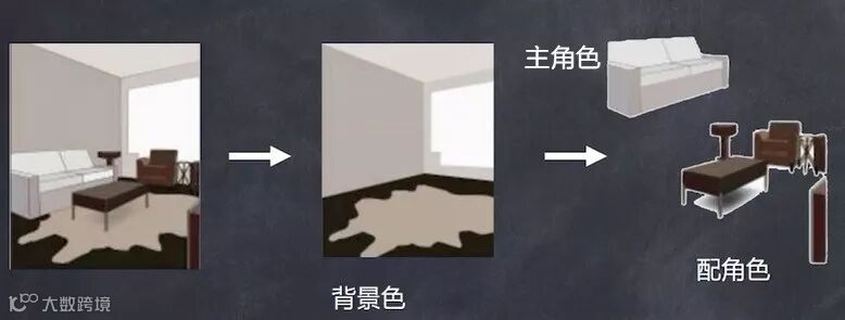 在某个空间中的所有彩色一共可以分为4类,分别是主角色、配角色、背景色和点缀色。