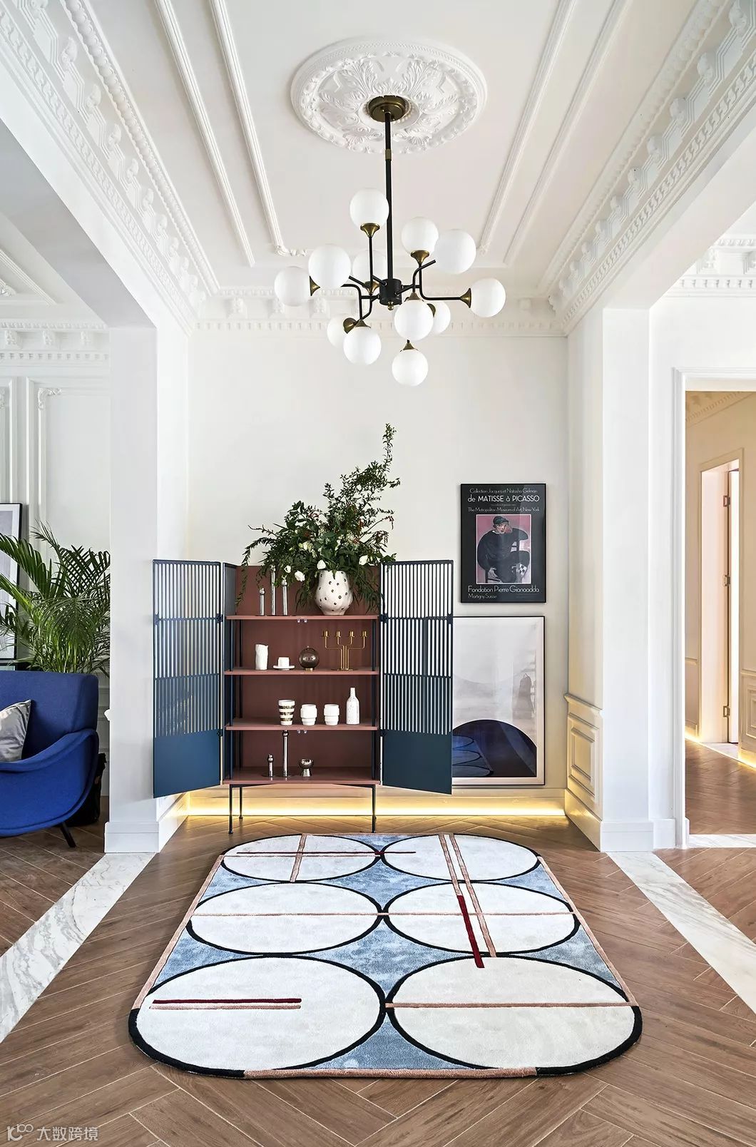 空间中的点缀色常常是指相框、花卉、抱枕、挂画等这些可以贯穿在整个空间之中的物品的颜色。