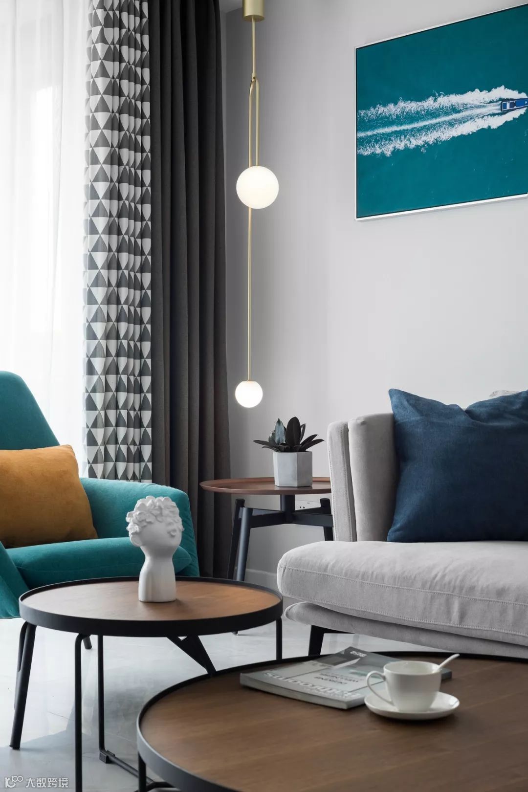 点缀色一般附着在抱枕、花卉绿植、装饰画及各类摆件器皿之上。而在使用这些物件时,要特别注意尺寸大小。因为点缀色的面积越小,色彩越强,点缀的效果才会越突出。