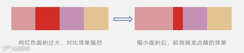 而右侧的色彩搭配则选用色相环上的蓝色(配角色)和红色(主角色),增大了两种颜色的色相差,明度上也产生了明显的差别,使主角色更加突出。