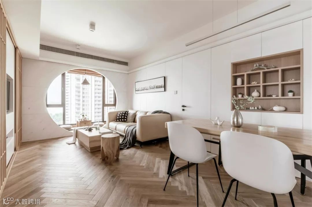 客厅墙面选用了明度很高的白色,与主角色对比强烈