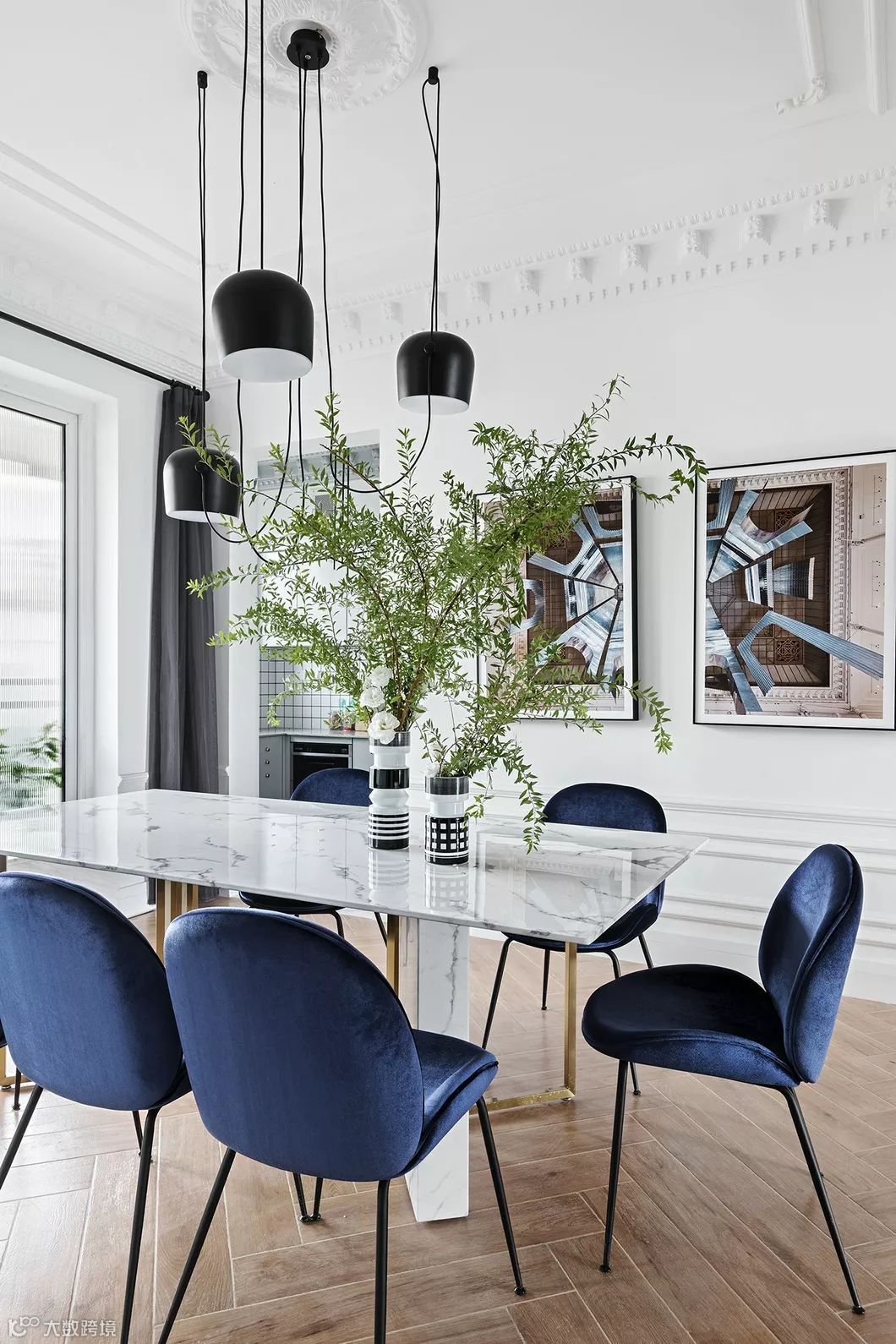 第二幅给人的整个感觉就不一样了,主人椅的颜色改为了蓝色,与餐桌的主角色形成了对比效果(色相、冷暖均对比),突出了主人椅在整个空间中的视觉占比。