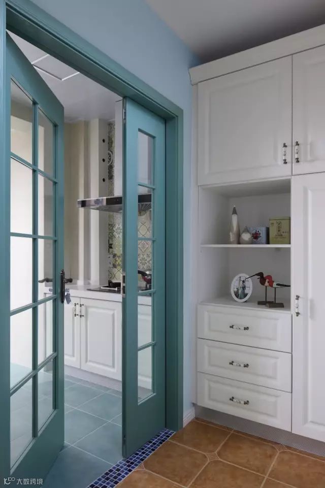 孔雀蓝色的厨房门,搭配厨房里面的花砖,整体效果复古情调又年轻;