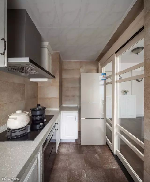 厨房与餐厅的地砖颜色保持一致,在打开厨房推拉门后,整个空间都感觉好宽敞大方;