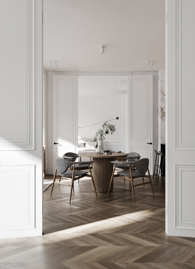 在传统派保守设计中,深色木门配深色地板的搭配较常见,木门颜色略微浅于地板颜色,以达到拉伸空间的视觉效果。