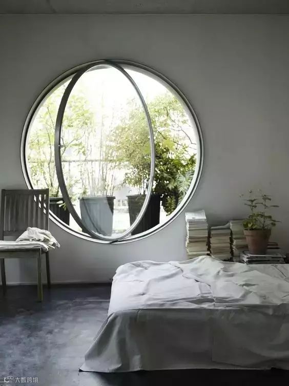 旋转窗并不少见,想想商场门口的旋转门,其实异曲同工。圆与圆的碰撞,让整个房间更加圆满,透过窗口看到的世界,也充满了禅意。