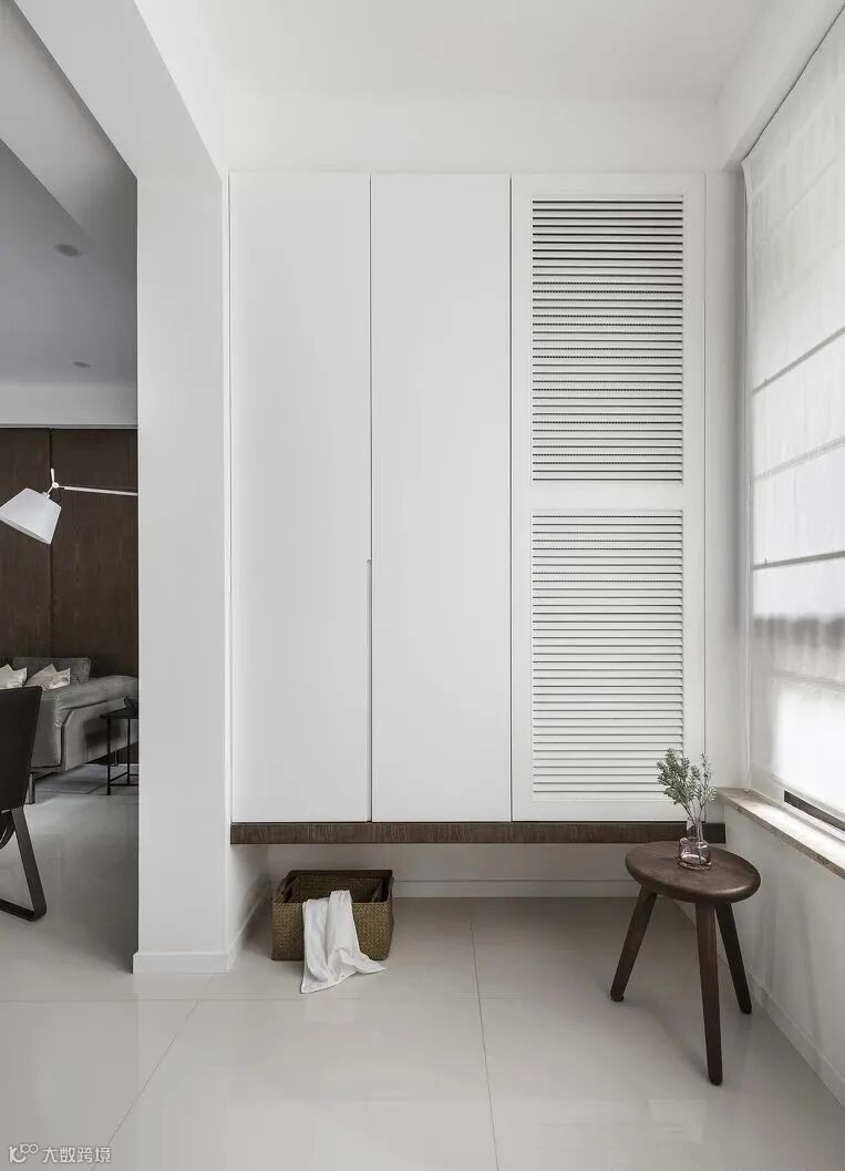 鞋柜常见使用百叶门片,目的是为了要通风,缺点是鞋子的味道会从正面扑鼻而来,而且造型很难突破。