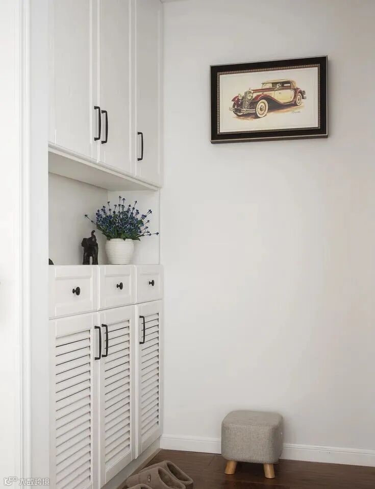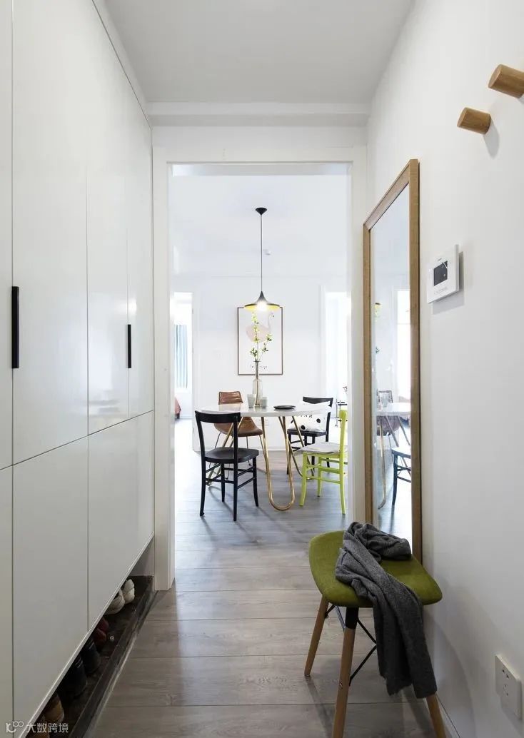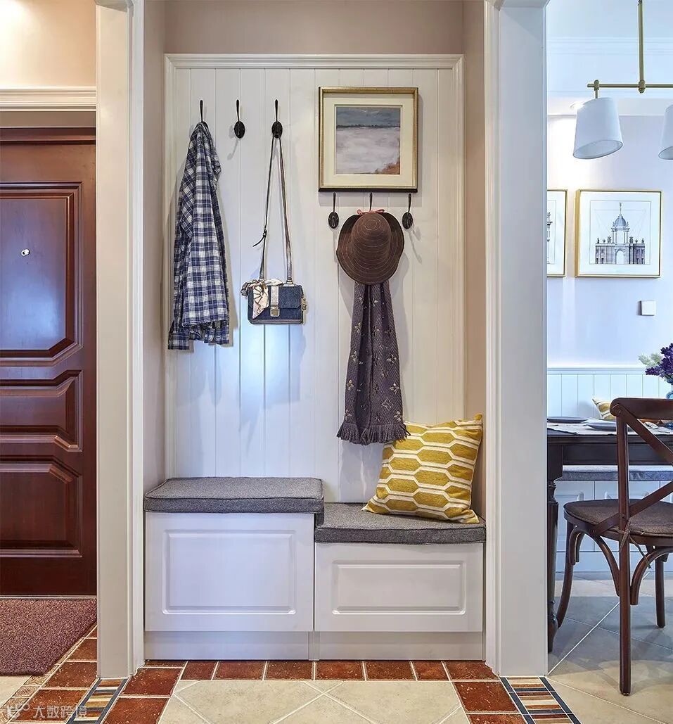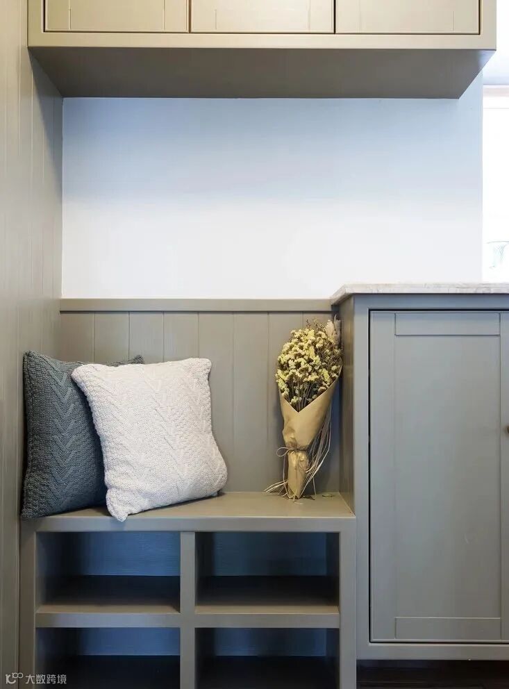 3.除了鞋柜底部留出空间,最好还能设计一个矮凳。可以用低矮的鞋柜代替,也可以直接放个凳子在这里,换鞋的时候就方便多了。