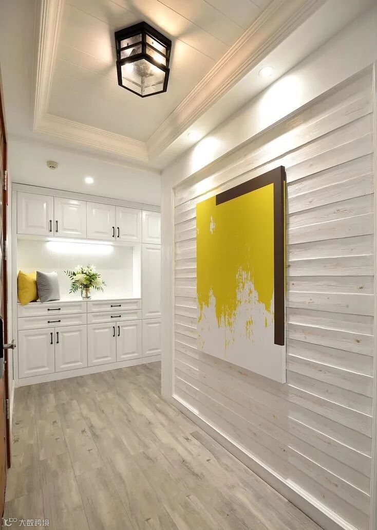 5.如果你家的鞋柜是当做隔断来用的话,那么在设计的时候上半部分一定不要做成封闭的,要像下面这样做成隔板可收纳的,光线才能进来。