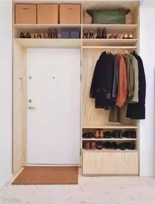 在门周围装一个全方位的橱柜,门左侧右侧再加上方,组成一个门字形橱柜,收纳空间超级大。