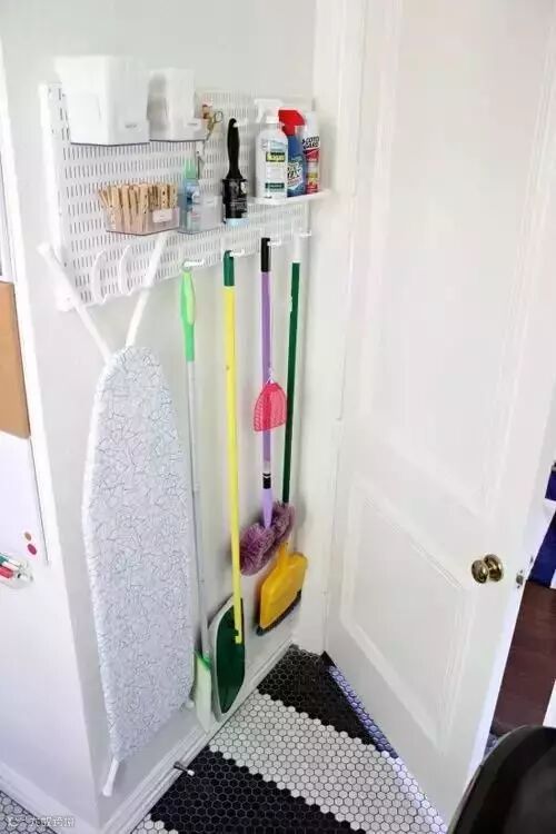 卫生间里还有各种清洁用具也需要整理,在墙上安一块洞洞板,挂上S钩,清洁工具朝上挂。