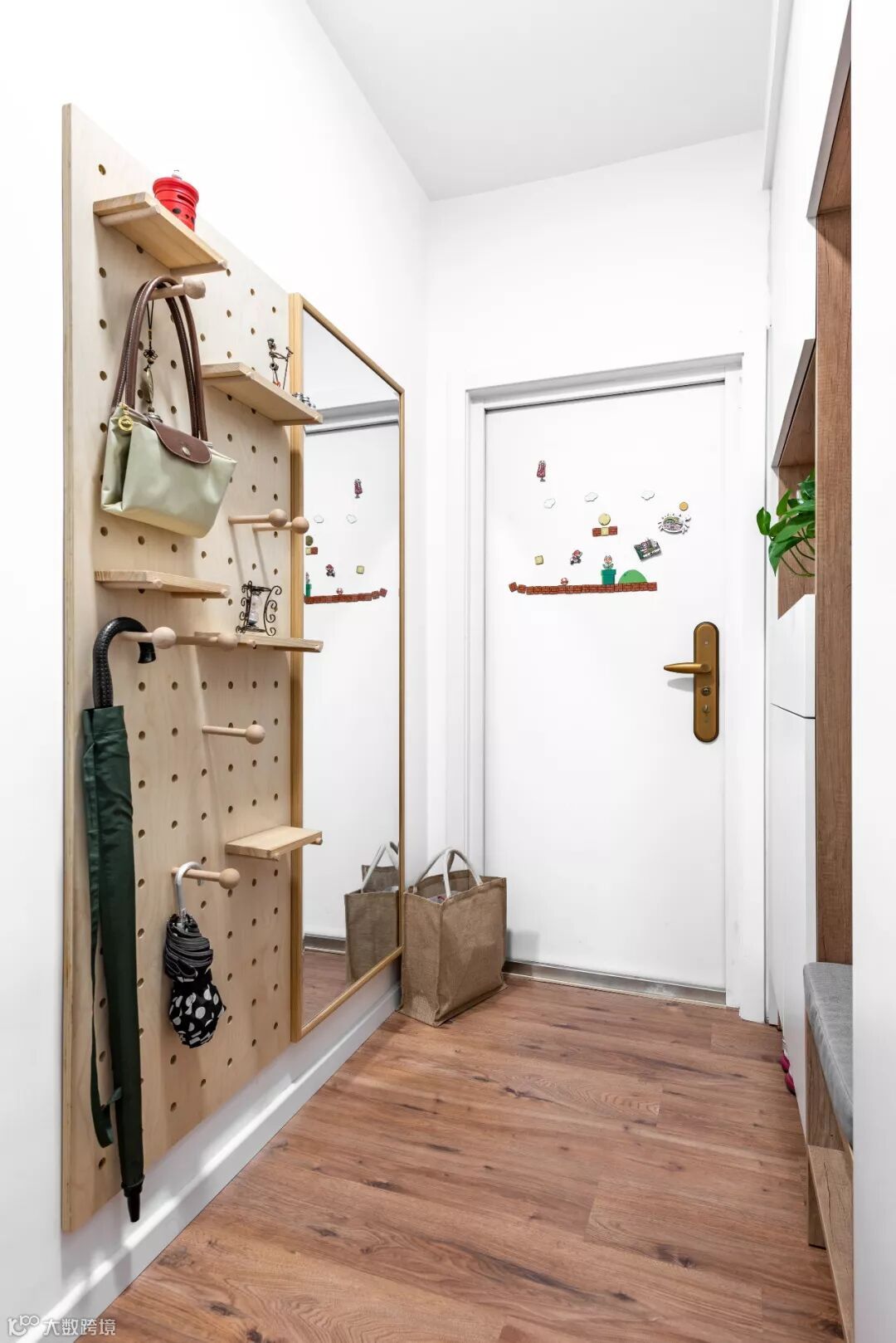 洞洞板是一种灵活的收纳方式,通过洞洞板收纳架,可以提供更加充足而又美观自然的玄关设计视觉。